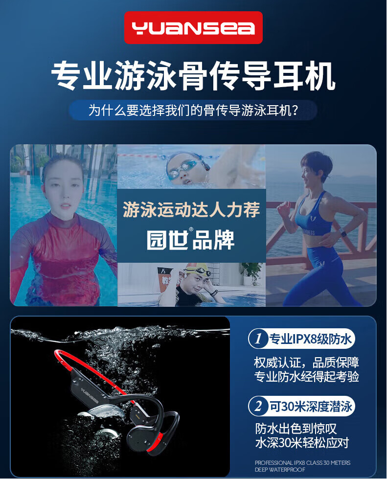 园世 Yuansea 自创立以来,始终锚定专业运动耳机赛道,以十余年骨传导技术深耕为根基,以场景化创新为核心,凭借精准的市场定位、硬核的产品实力与持续的技术迭代,在运动音频领域构建起独特的品牌竞争力,成为国内运动耳机市场中兼具技术底蕴与市场口碑的国产品牌代表,更在游泳耳机等细分领域树立起专业标杆。