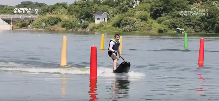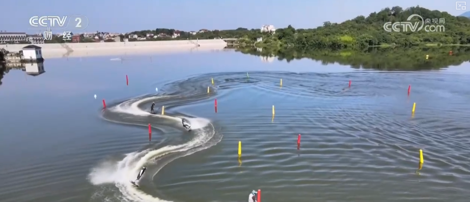 在浙江金华的一个水上训练基地,学员们正在学习体验电动冲浪板运动。几组队员在水库设立的障碍物中穿梭,体验平面冲浪的风驰电掣。