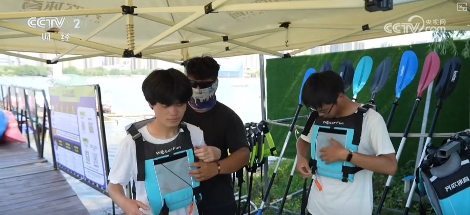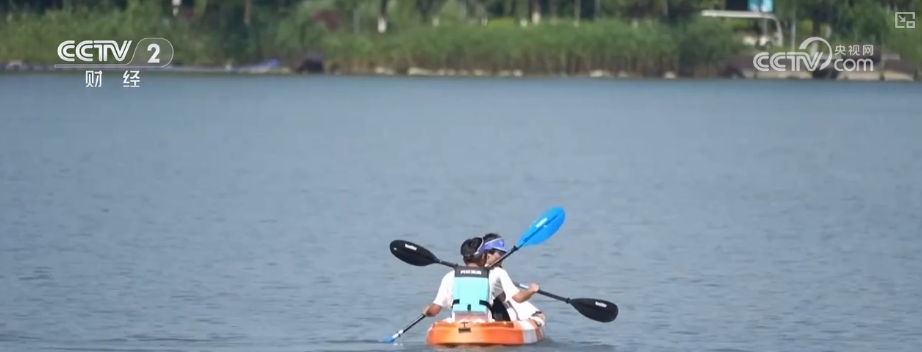 皮划艇也是不少消费者的选择。在江苏太仓,刚放暑假的大学生刘犇和同学一起来到天镜湖水上运动基地,接受教练的专业指导。两人划着皮划艇,绕着风光旖旎的湖面飘荡了两圈。