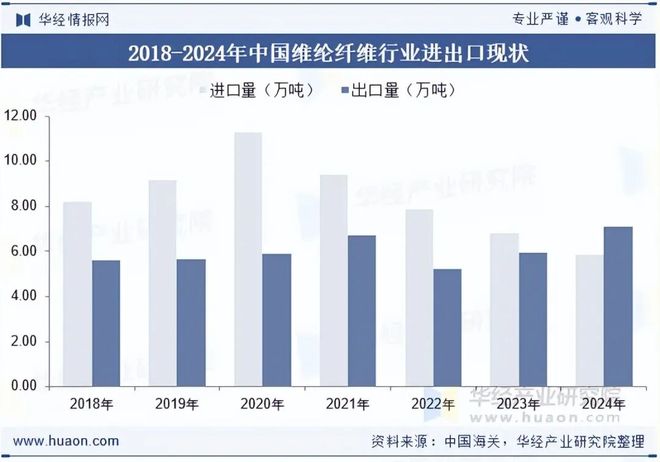 维纶纤维的市场需求增长空间较大,但由于国内市场供应不足,因此对进口产品依赖度较大。据统计,截至2024年我国维纶纤维行业进口量为5.87万吨,同比下降14.18%,出口量为7.12万吨,同比增长19.26%。