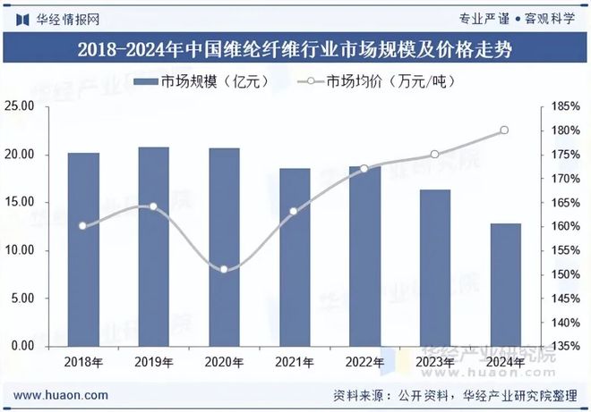 维纶纤维产品用途由之前的民用纺织产品逐步转向高档服装制造、造纸、建材、建筑及水利工程等领域,产品结构向水溶低温与高强高模方向发展,其中的主流纤维品种为水溶性维纶纤维、阻燃维纶纤维和高强高模维纶纤维。据统计,截至2024年我国维纶纤维行业市场规模为12.87亿元,市场均价约为1.8万元/吨。