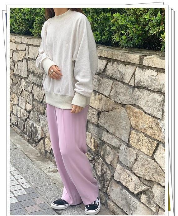 将薰衣草色的阔腿裤和前呼斯恶运动衫搭配结合在一起,而鞋子选择黑色来增强对比,进一步突出了裤子的美丽色彩。