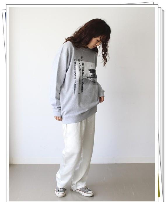 印花设计的运动衫更显时尚,搭配缎面材质的白色裤子,不会让你显得幼稚。再配上灰色的帆布鞋,它和运动衫的颜色相同,简单休闲的舒适造型就完成了。