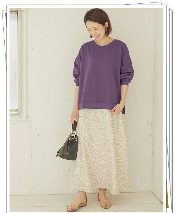 紫色的运动衫即使在休闲穿搭中也能带来精致的感觉。搭配春季罗纹裤,享受休闲造型。将白色的长T恤叠穿在里面,并露出领口和下摆,给造型增添了时尚感觉和鲜明的层次感。