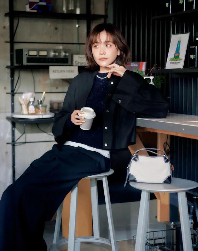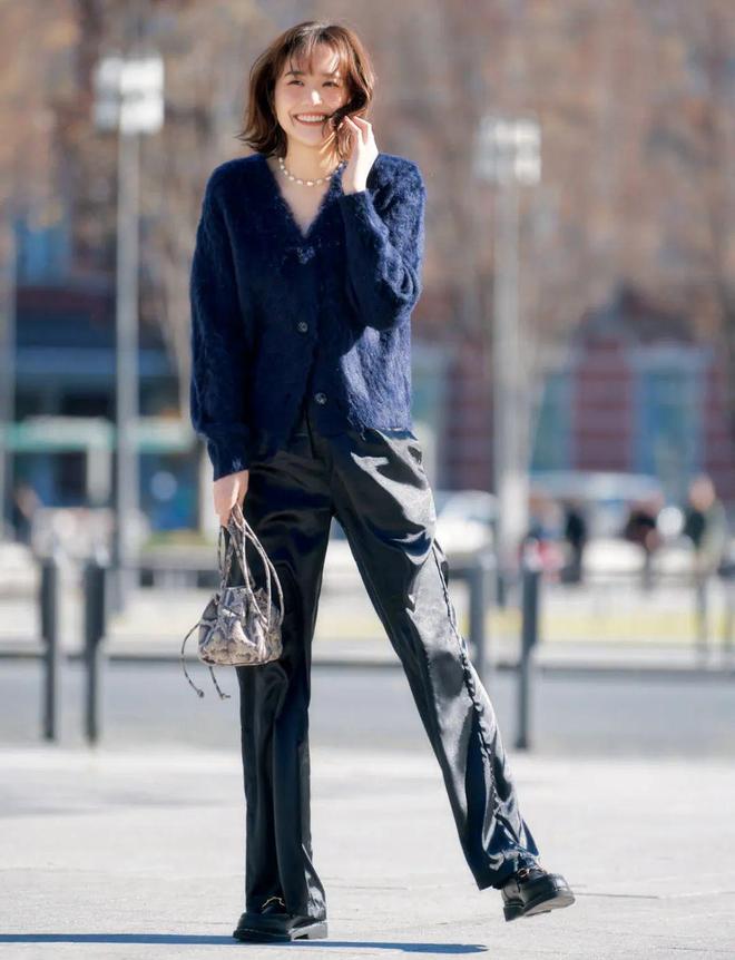 海蓝针织衫上套一件黑色衬衫,洒脱时髦。中间加入一抹白色,增添层次感,避免整体色调沉重。
